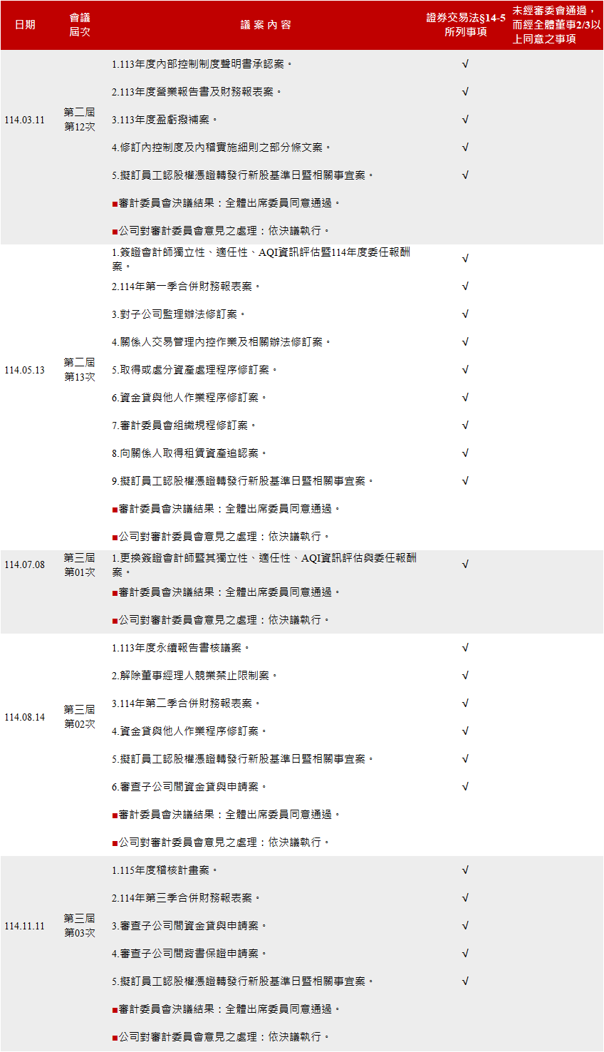 (一)有關證券交易法第14條之5所列事項之會議日期、期別、議案內容、審計委員會決議結果及公司對審計委員會意見之處理,羅列如下: