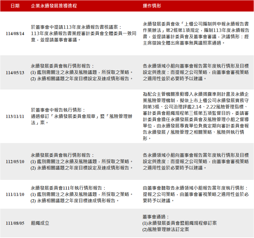 並配合永續發展專責單位負責推動並執行永續發展所需之相關作業。