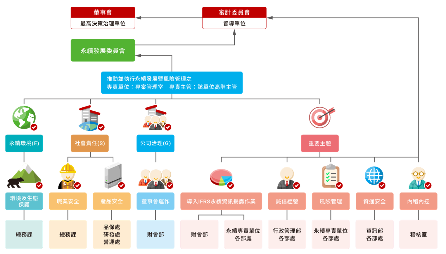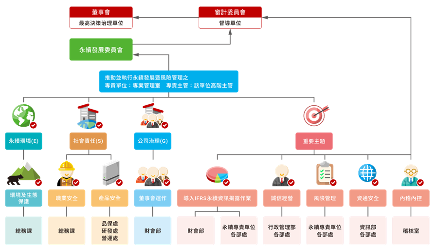 ➤ 依各部處專業職能﹐組織成立必要之工作小組、分別負責推動企業永續發展之永續環境(E)、社會責任(S)、及公司治理(G)(含誠信經