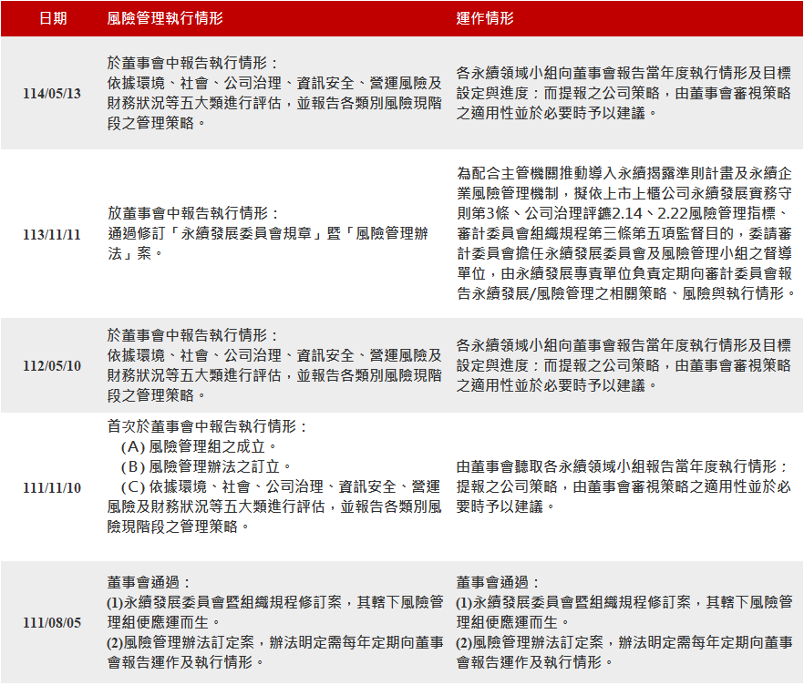 ➤ 風險管理運作情形,由永續發展委員會最高主管或其指定之人,每年定期向董事會報告運作及執行情形。